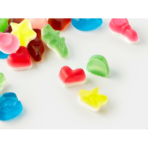 Ingrédients : Sirop de glucose, sucre, gélatine, amidon, acidifiants (acide citrique, acide malique), arômes, concentrés de fruits et de plantes (pomme, fraise, orange, citron, framboise, cassis, baie de sureau, carotte, aronia, hibiscus), sirop de sucre inverti, correcteurs d’acidité (citrate de sodium, malate acide de sodium), colorants (curcumine, bleu patenté V, anthocyanes, carotènes, lutéine), agents d’enrobage (cire d’abeille blanche & jaune, cire de carnauba).