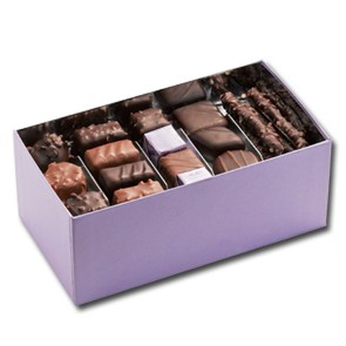 Ingredients:sucre, fèves de cacao, beurre de cacao, AMANDE, NOISETTE, sirop de glucose, LAIT en poudre, crème (LAIT), orange, fruit de la passion, miel de tournesol, beurre pâtissier (LAIT), beurre (LAIT), framboise, conservateur : sorbitol, sirop de sucre inverti,