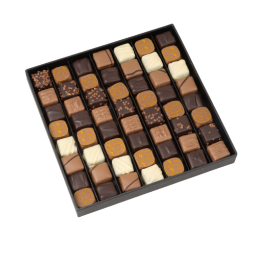 Ce coffret raffiné renferme 56 bouchées gourmandes en vrac, soigneusement sélectionnées pour offrir une expérience sensorielle complète : ganaches fondantes, pralinés croustillants, chocolats au lait, noirs ou blancs… Chaque pièce est le fruit d’un savoir-faire artisanal et d’une exigence constante de qualité.