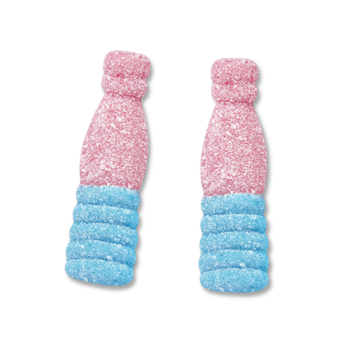 Ingrédients : Sirop de glucose-fructose, sucre, gélatine, acidifiants (acide citrique, acide malique), correcteur d’acidité (malate de sodium), colorants (E120, E133, E170), arôme.