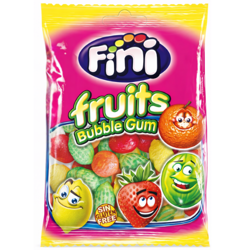 Assortiment de chewing gum fruités aux formes et couleurs variées, présenté en sachet pratique de 90 g.
