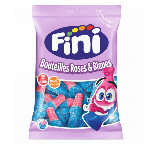 Bonbons gélifiés halal en forme de bouteilles roses et bleues avec un enrobage acidulé, conditionnés en sachet de 90 g.