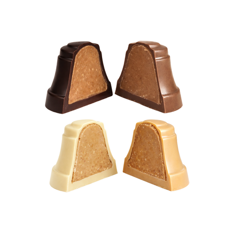Cet assortiment réunit plusieurs cloches en différents chocolats : noir, lait, blanc et Dulcey 35% selon la composition. Chaque cloche renferme un cœur fondant de praliné aux amandes et noisettes finement torréfiées, offrant un équilibre parfait entre douceur et intensité aromatique.