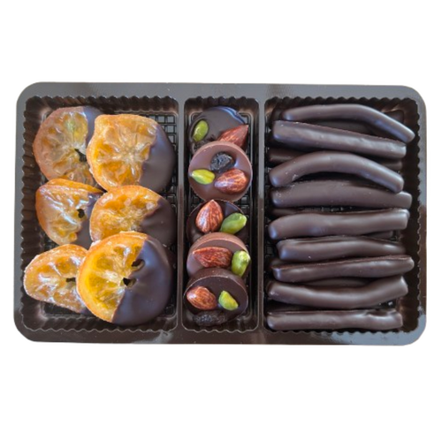 Coffret gourmand de 170g réunissant orangettes, clémentines confites et mendiants au chocolat noir 67 % et lait. Une fabrication artisanale pour un cadeau raffiné.