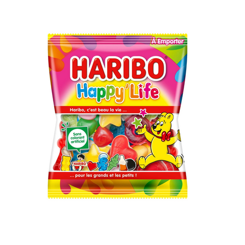 (F) CONFISERIE ASSORTIE / Ingrédients: sirop de glucose; sucre; dextrose; gélatine; amidon; acidifiants: acide citrique, acide malique; arôme; concentrés de fruits et de plantes: carthame, spiruline, pomme; sirop de caramel; correcteurs d’acidité: citrate monosodique, malate acide de sodium; colorants: curcumine, charbon végétal, lutéine, anthocyanes; agents d’enrobage: cire d’abeille blanche et jaune, cire de carnauba. Tenir à l’abri de la chaleur et de l’humidité. Peut contenir des traces de BLE, LAIT.