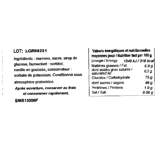 Ingrédients : Marrons, sucre, sirop glacés glucose, humectant : sorbitol, vanille bois gousses, conservateur : E202