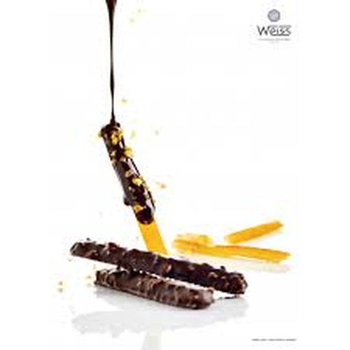 Les traditionnelles orangettes Weiss sont réalisées avec des écorces d’orange Navel confites et des grains de nougatine maison enrobés au chocolat noir.